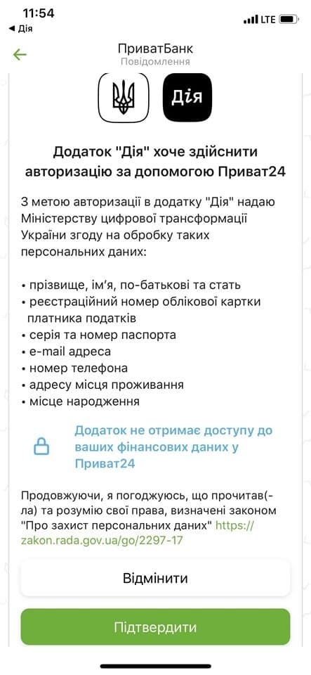 Під час авторизації у додатку «Дія»(а це можна зробити через Приват24 або БанкID), додаток захоче отримати від вашого банку ваші ПІБ, стать, індивідуальний податковий номер (облікову картку платника податку), імейл, номер телефону, місце проживання, місце народження. І у вас є лише один варіант – дозволити банку передати Мінцифрі всі ці дані, або не користуватись додатком.