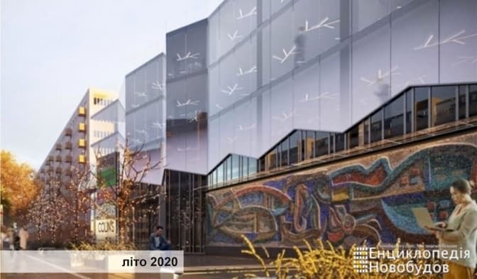 Урешті, до останнього часу увага була прикута до відновлення мозаїки, але не було зрозуміло, як же буде виглядати сам об’єм будівлі. У мережі почали з’являтись нові версії фасаду з білою молочною розтяжкою на склі, але на місці фасад тільки починали монтувати. І результат встановлених конструкцій особисто мене сильно розчарував. Об‘єм трьох поверхів є абсолютно плоским монолітом, «технічні» приміщення на даху явно переросли задекларовані в містобудівному розрахунку об‘єми.