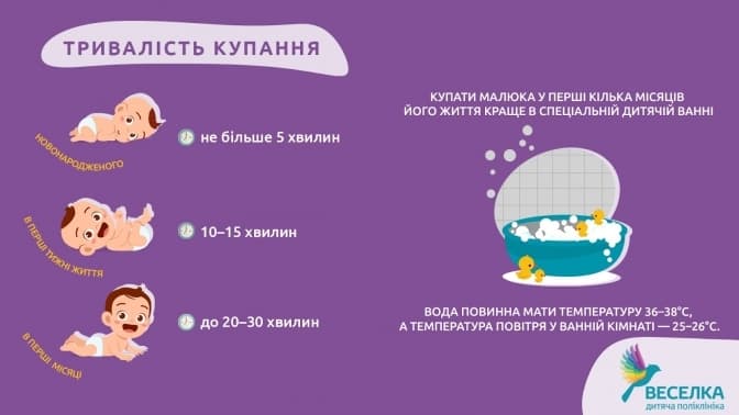 Перше купання новонародженого має відбуватися вдома, в день виписки з пологового будинку. Тривалість перших купань дуже коротка – не більше 5 хвилин, та з кожним днем цей час можна збільшувати. Приблизний час купання, якого достатньо в перші тижні життя дитини, – 10–15 хвилин, та з кожним тижнем його можна продовжувати й довести урешті до 20–30 хвилин.