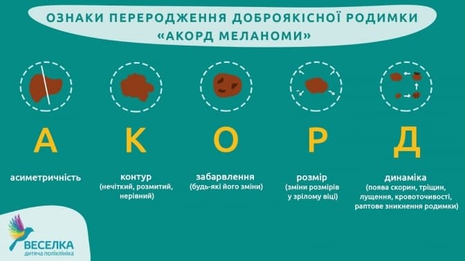Виявити ознаки переродження доброякісної родимки допоможе проста пам’ятка, що має назву «АКОРД меланоми»: А – асиметричність, К – контур (нечіткий, розмитий, нерівний), О – забарвлення (будь-які його зміни), Р – розмір (зміни розмірів у зрілому віці), Д – динаміка (поява скорин, тріщин, лущення, кровоточивості, раптове зникнення родимки).