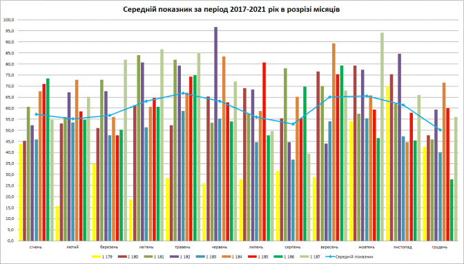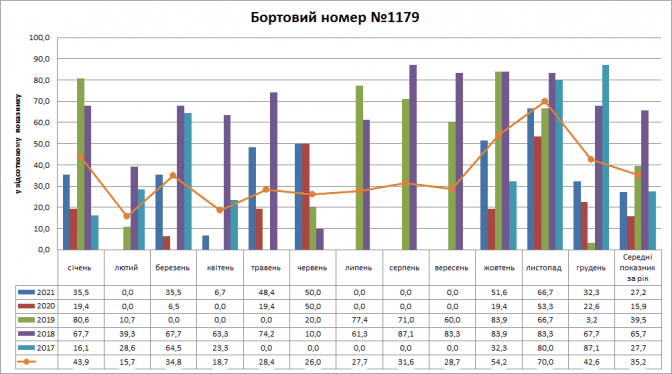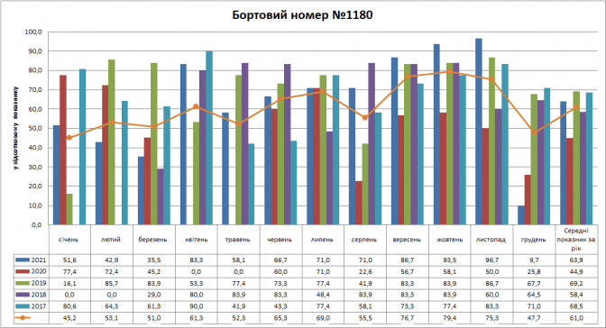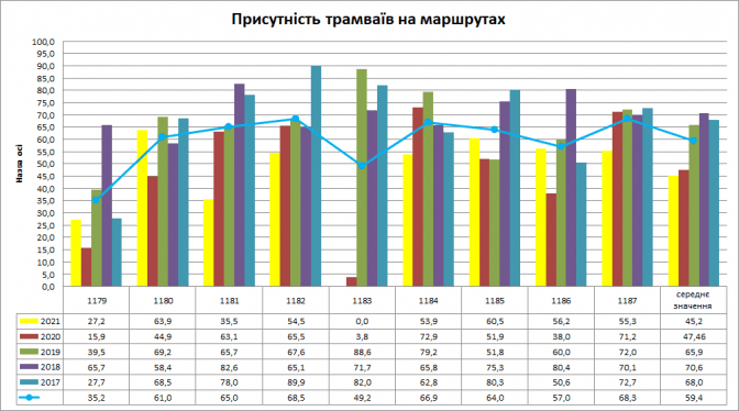 Із цієї діаграми видно в розрізі кожного місяця 2017 – 2021 років показник присутності трамваїв на маршрутах. Синьою лінією зведений середній показник за п’ять років, окремо кожен місяць. У грудні найменше курсувало трамваїв – 50,1%, у серпні – 52,9%, в лютому – 55,2%, в липні – 56%, у березні – 56,7%. Найвищий показник був у травні – 66,9%, у жовтні – 65,6%, у вересні – 65%.