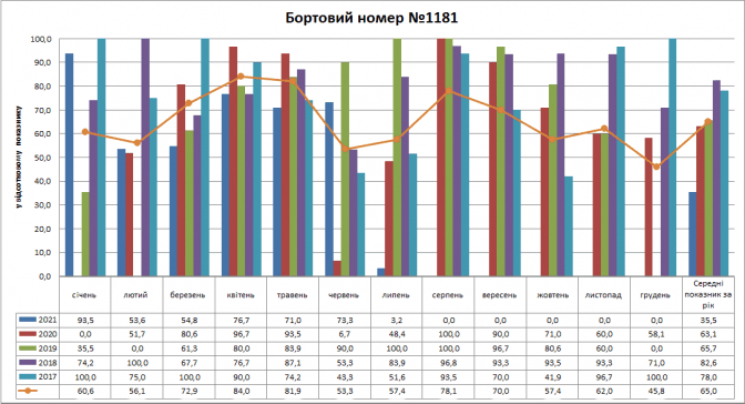 Не менш важливим маркером, за яким можна аналізувати стан справ із трамваями «Електрон», є зведений показник у розрізі років. Ми чітко бачимо що з 2018 року (70,6%) до 2021 року (45,2%) показник виходу трамваїв на маршрут значно знизився.