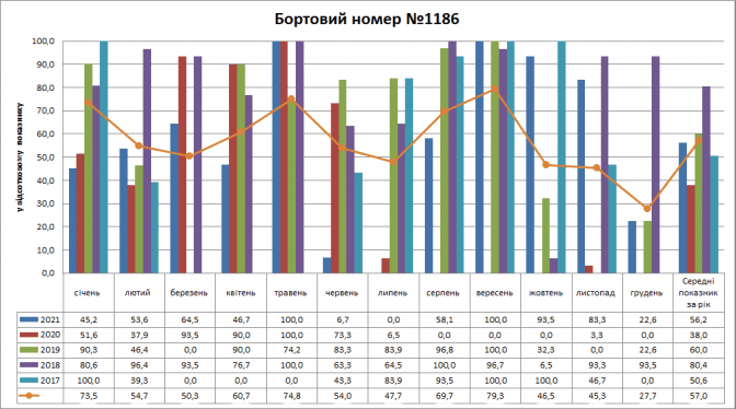 Вагон №1186 найкраще працював на маршруті у 2018 році (80,4%), а найгірше у 2020 році (38,0%). Найбільша присутність була у вересні (79,33%), а найменша в грудні (27,74%).