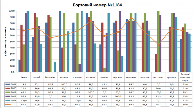 Вагон №1184 найчастіше був присутній на маршруті у 2019 році (79,2%), найгірше у 2021 році (53,9%). Найкраща присутність трамвая була у вересні (89,33%), а найгірша в листопаді (44,7%).