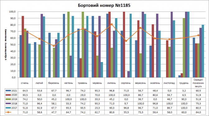 Трамвайний вагон №1185 найчастіше був присутній на маршруті у 2017 році (80,3%), а найгірше в 2019 році (51,8%) і в 2020 році (51,9%). Найбільша присутність була у липні (80,6%), а найменша у березні (47,7%).