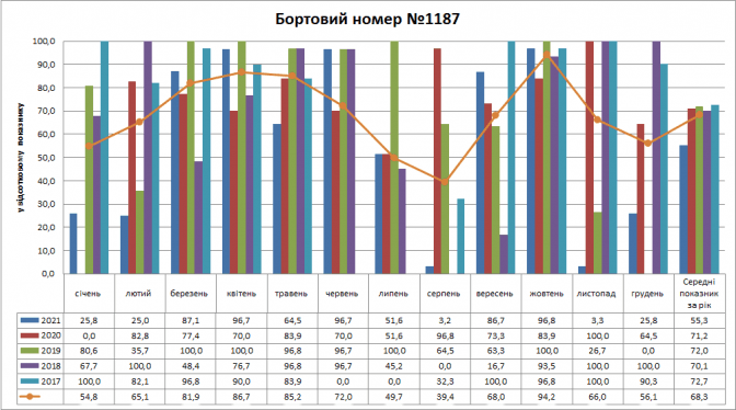 Вагон №1187 найчастіше їздив на маршруті у 2017 році (72,7%) і в 2019 році (72,0%), найгірше в 2021 році (55,3%). Найбільша присутність була у жовтні (94,2%), а найгірша у серпні (39,4%).