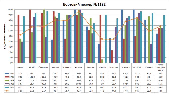 Трамвайний вагон №1182 найчастіше був присутній на маршруті у 2017 році (89,9%) і в 2019 році (67,6%), найгірший показник у 2021 році (54,5%). Щодо показників у розрізі місяців, то найкраща присутність була у червні (96,7%), а найгірша у вересні (44,0%).