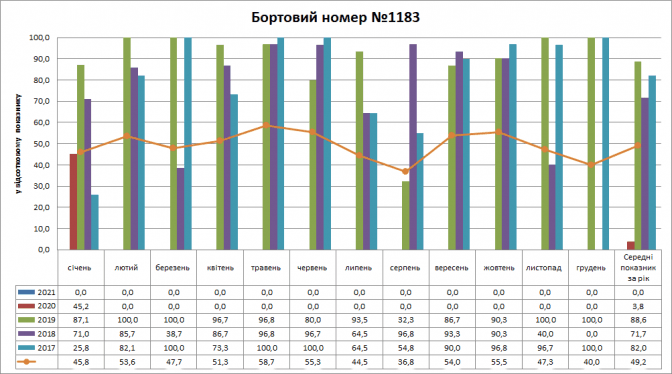 Що стосується трамвайного вагона №1183, то найчастіше він був присутній на маршруті у 2019 році (88,6%) і 2018 році (71,7%). Найнижчі показники були в 2021 році (0,0%) і в 2020 році (3,8%). Також бачимо, що цей трамвай із січня 2020 року не їздить. Щодо показників у розрізі місяців, то найкраща присутність була в травні (58,7%), а найгірша в грудні (40,0%).