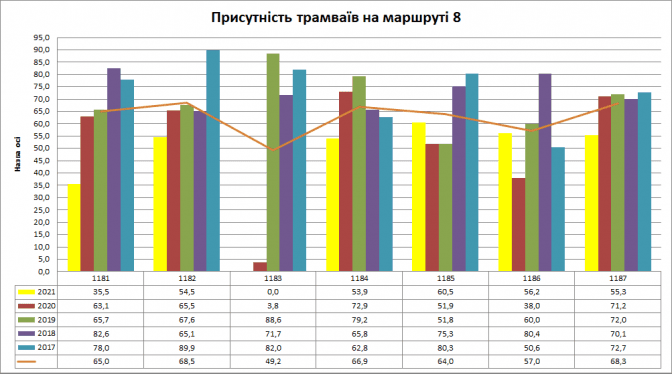 Якщо придивитися до коричневої лінії, то побачимо, що середній показник присутності «Електронів» на трамвайному маршруті №8 становить усього 62,7%. А якщо брати в розрізі кожної одиниці, то вагон з інвентарним №1183 тільки 49,2% днів у 2017 – 2021 роках був на маршрутах, а максимальний показник присутності є у трамвая з інвентарним №1184 (66,9%).