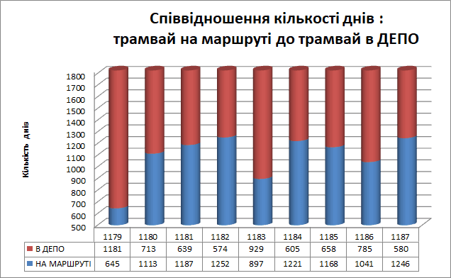 Як бачимо з діаграми, показник експлуатації трамваїв дуже низький. Трамвай з інвентарним №1179 працював лише 645 днів, №1181 стояв на території депо (що еквівалентно два роки працював, а три простоював). Не краща ситуація з трамваями, які були закуплені для експлуатації на трамвайному маршруті №8 пл. Соборна – вул. Вернадського. Трамвай з інвентарним №1183 виїжджав на маршрут тільки 897 днів із 1826, №1186 курсував 1041 день, а 785 днів стояв на території депо (фактично два роки з п’яти).