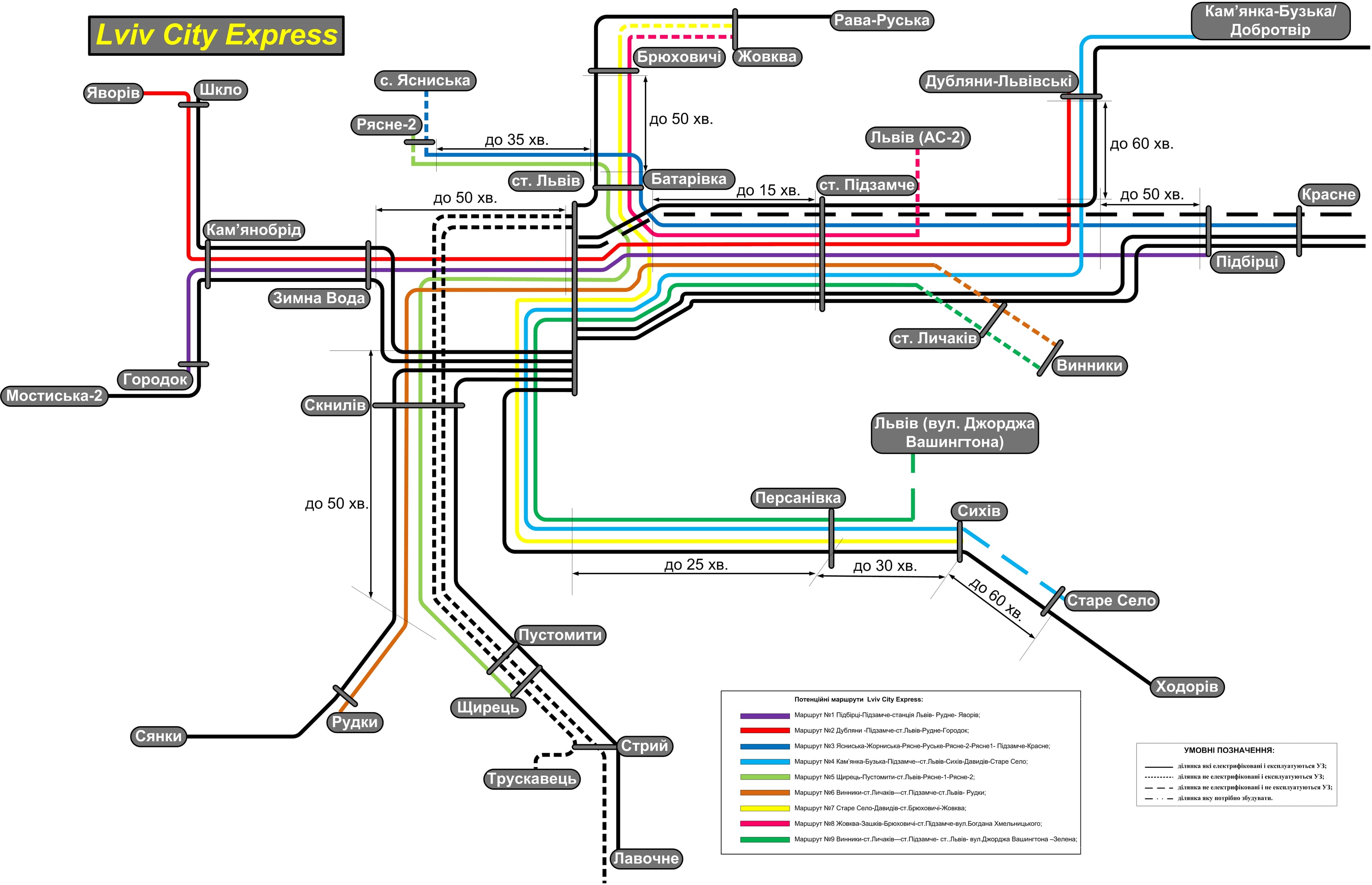 Якщо аналізувати інтервали між поїздами, які планують закупити для проєкту Lviv City Express, то в межах Львова час поїздки становитиме 15-25 хвилин залежно від ділянки. Найбільша кількість маршрутів у північно-східній частині Львова (район станції «Підзамче»), тож час між поїздами тут буде до 15 хвилин; у північно-західній частині (район «Рясне») інтервал становитиме від 20-30 хвилин; у західній частині міста (смт Рудне) – 30-50 хвилин; у південній частині (Сихівський район) – до 30 хвилин.