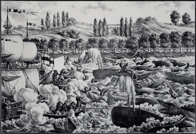 Карл Ауер. Боротьба з морськими потворами, літографія до вистави на Пелчинському ставі у Львові