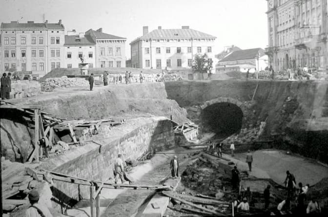 Засклепіння Полтви на ділянці між витоком вул. Коперника (сучаний просп. Свободи) та будівництво Львівської Опери, 1934 р. Фото Oberhard L./NAC