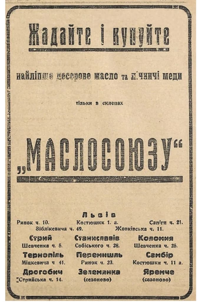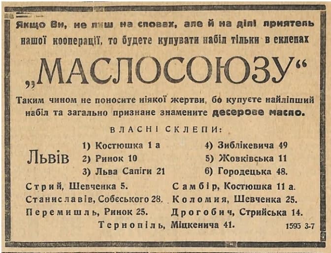 Торговий відділ Маслосоюзу розташований у Львові за адресою вул. Костюшка 1а