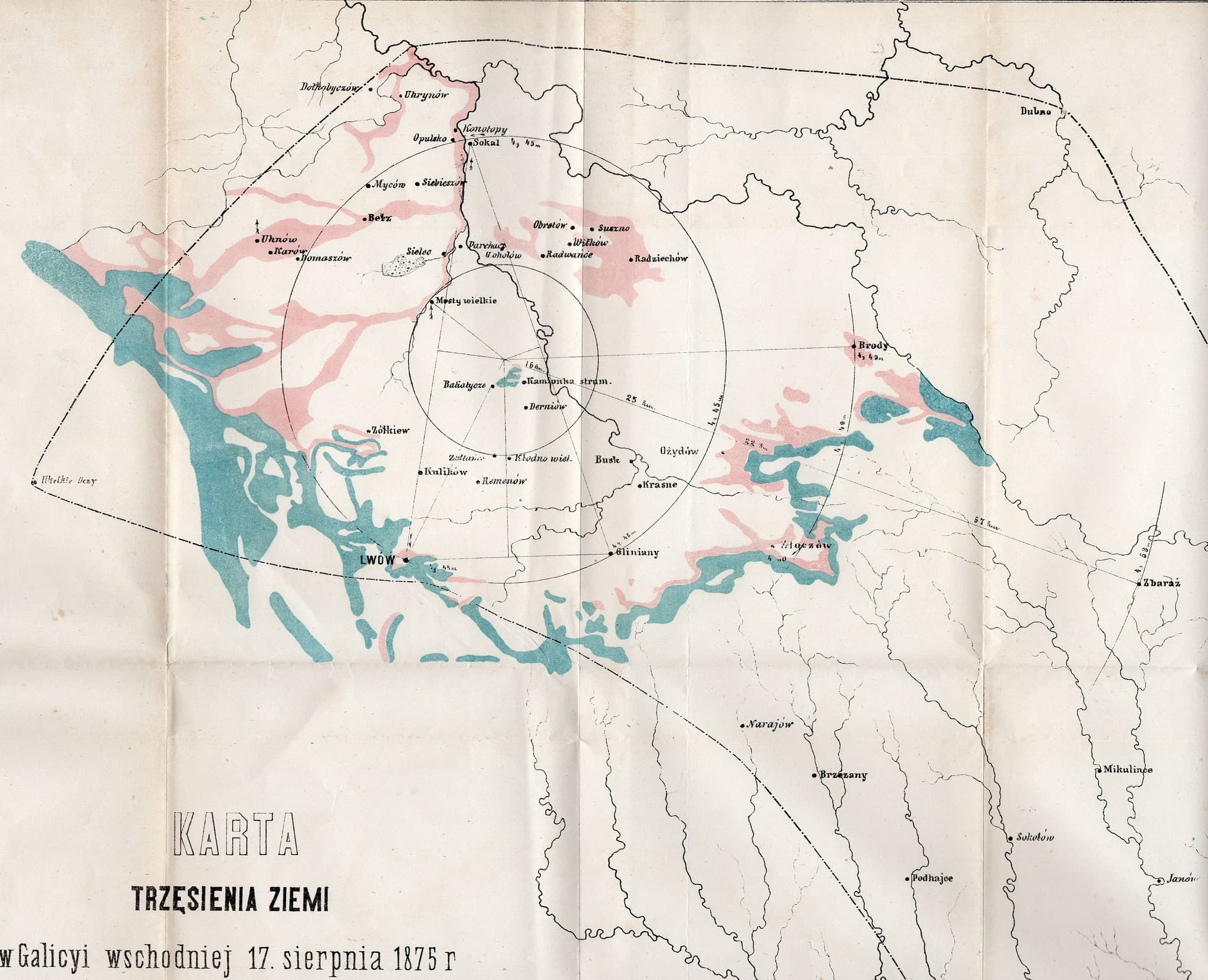 На цій карті показано, як тряслася земля на північно-східних околицях Львова під час землетрусу 17 серпня 1875 року із вказанням його епіцентру (дослівна назва: «Karta trzesienia ziemi w Galicyi wschodniej 17 sierpnia 1875 r. przez prof. F.Kreutza na podstawie karty monarchii austryjacko-węgierskiej wydanej przez F. de Bauera»). Цю карту передав до фондів Бережанського історико-краєзнавчого музею Мирон Постолан, а виклав на своїй сторінці директор музею Микола Проців.