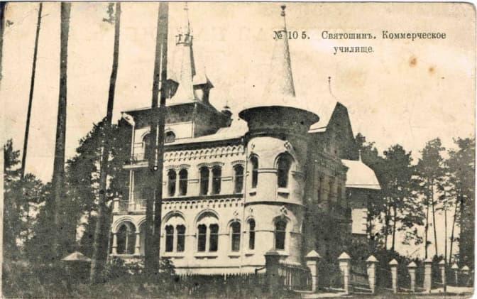 Був тут і свій навчальний заклад, схожий на замок. Перші вступні іспити відбулися в серпні 1909-го. На навчання тоді зарахували 48 хлопців та чотири дівчинки. У 1909 році в Святошині організували приватне комерційне училище підприємиці Олени Долинської. Спочатку воно розміщувалося на сучасному проспекті Перемоги, а з 1912 року під нього перебудували згорілий приватний особняк Барського.