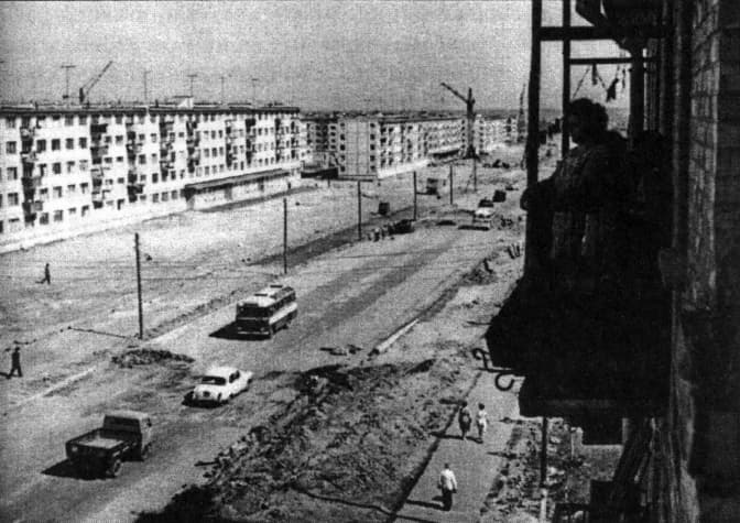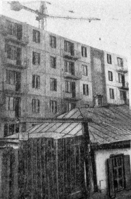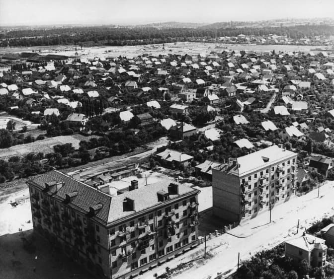 Перші багатоквартирні будинки на Нивках, 1957 рік. На розі Вовчогірської (Естонської) та Щербаківського (автор: Г. Угринович)