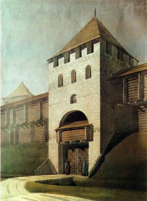 Реконструкція Батиєвої (Софійської брами), що стояла на розі Володимирської та Великої Житомирської. Автор: Юрій Асєєв