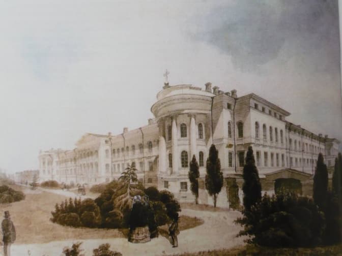 Однак мало хто знає, що за задумом архітекторів цей корпус спочатку був пофарбований у білий колір. Це його зображення увічнене на акварелі знаменитого художника Сажина – друга Тараса Шевченка.