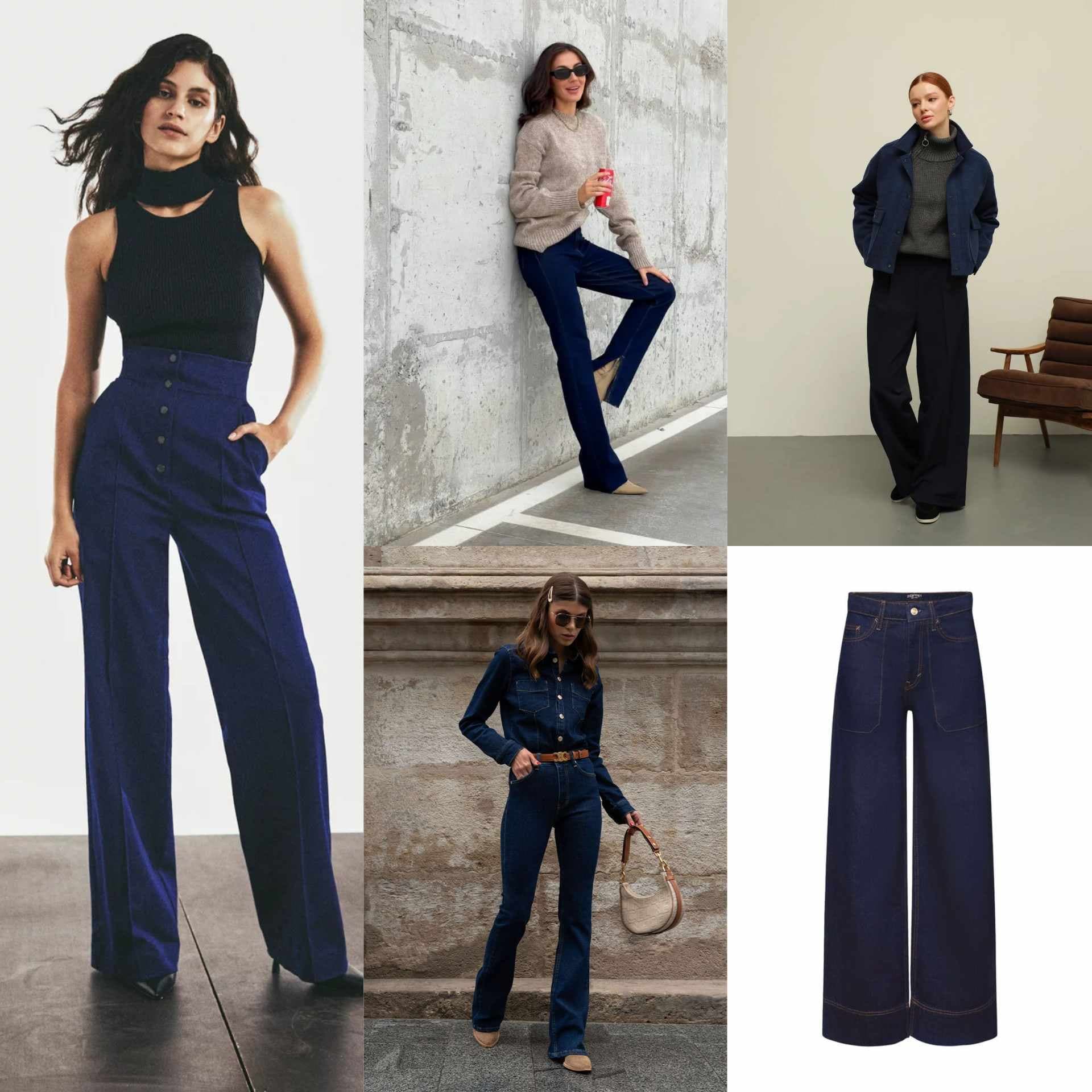 Також в моді темно-сині джинси кльош, які круто виглядають і з пальтами, і з куртками.