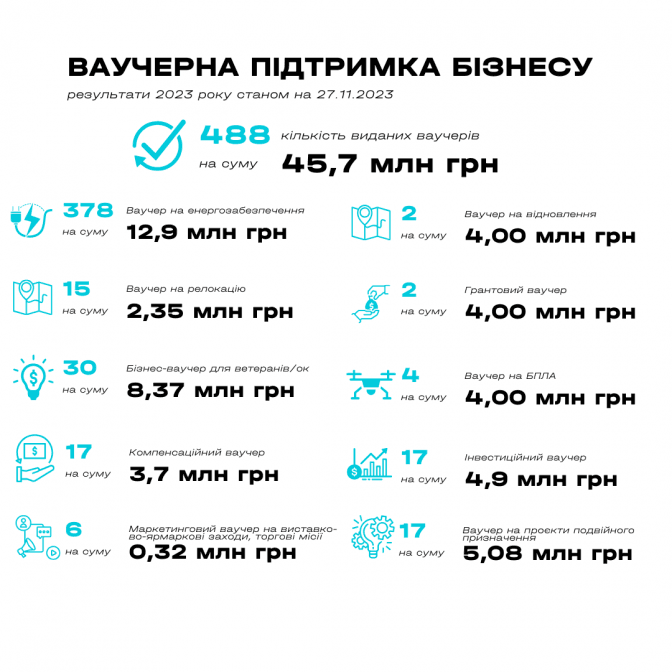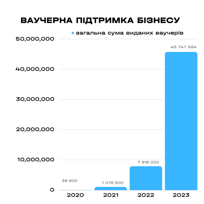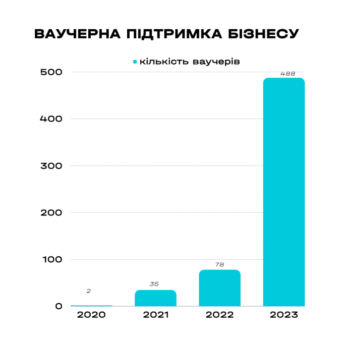 Працюємо ми і з ветеранами та їхніми родинами. Цьогоріч видали вже 30 ваучерів на суму 8,37 млн гривень на розвиток бізнесів ветеранів(ок) або членів їхніх родин. Багато хто з військових вже повернувся з фронту, часто їхні попередні робочі місця більше неактуальні або ж вони дійсно хочуть створити власну справу. Ці ваучери — шанс розпочати нове життя і дуже важлива підтримка, для тих, хто віддає свій час, своє здоров'я заради нашого захисту.