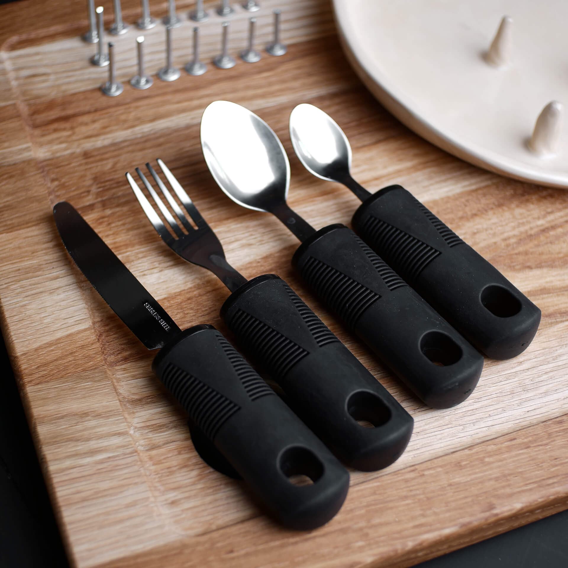 Що з виделками, ложками, ножами? Адаптивні прибори досить просто знайти і придбати в інтернеті, вони більш поширені, ніж тарілки. Так і ми закуповували прибори в комплект до one-handed plate для нашої мережі.