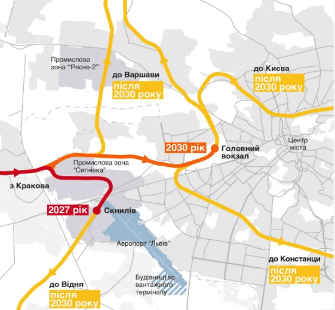Опублікована схема львівського залізничного транспорту свідчить, що всі нові швидкісні поїзди зупинятимуться на чинному центральному залізничному вокзалі. Для цього планують використовувати чотири–п’ять колій, які вже існують у межах міста. Водночас ці колії нині задіяні для інших перевезень. Крім того, є різниця між шириною колій, необхідних для швидкісних поїздів, і тих, якими курсують більшість поїздів в Україні.