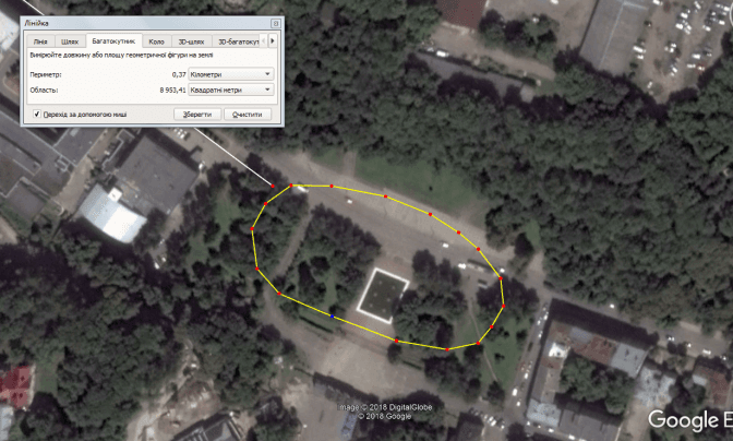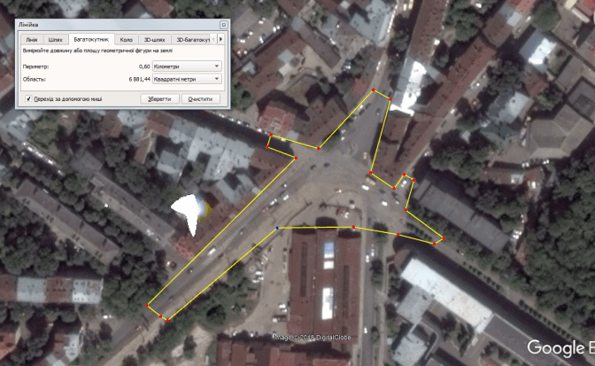 Обміри площі по Гуглоземлі показують трохи менше 7 тис. кв. м. Якісь закутки я міг пропустити, тому для чесності округлимо до 10 тисяч. Глибина води в найглибшому місці затоплення становила приблизно метр. Звісно, так було не всюди, але для спрощення обрахунків уявимо, що глибина була всюди однакова. Виходить, що на перехресті загалом набралося 10 тис. кубометрів води.
