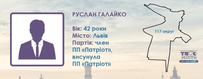 Партія «Патріот» висунула кандидатом у 117-му виборчому окрузі 42-річного партійця Руслана Галайка. Він має середню спеціальну освіту, зараз тимчасово не працює. Втім, на сайті партії Миколи Голомші, за списком якої до Ради також балотується Іво Бобул, про Руслана Галайка немає жодної інформації.