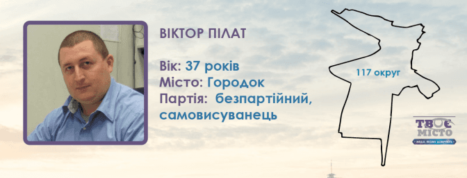 Віктор Пілат — 37-річний безпартійний самовисуванець у 117-му окрузі. За даними автобіографії, живе у Городку, працює головним інженером у ТзОВ «Екопавер», що займається, зокрема, виробництвом індивідуальних теплових пунктів для багатоповерхівок. Підприємство також працює на балтійські країни та білоруський ринок. За даними Youcontrol, він є також засновником кількох інших компаній — «Біопавер», «Датапавер». У політичній діяльності раніше помічений не був.