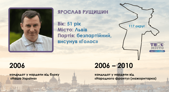 51-річний безпартійний львівський підприємець Ярослав Рущишин у 117-му окрузі висунутий партією Святослава Вакарчука «Голос». Має вищі освіти у галузі економіки, права та бізнес-адміністрування.