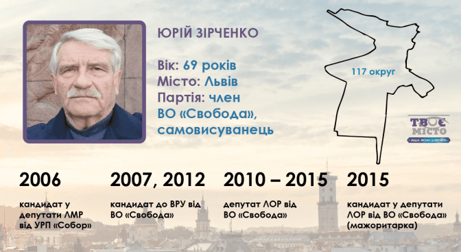 69-річний член ВО «Свобода» Юрій Зірченко у 117-му окрузі кандидатом висунув себе сам. Він був багаторічним заступником голови Львівської обласної спілки політв’язнів України, також неодноразово балотувався у ради різних рівнів. За даними «Чесно», у 2006 році Юрій Зірченко ішов до ЛМР за списками УРП «Собор», але депутатом не став. Втім, на наступних виборах — у 2010 році — став депутатом ЛОР від ВО «Свобода». У 2007 і в 2012 роках він балотувався до ВРУ — так само від «Свободи». Востаннє, за даними «Опори», він Юрій Зірченко був №118 у списку партії.