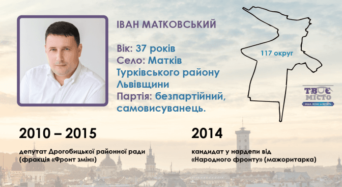 Ще один самовисуванець у 117-му окрузі — безпартійний 37-річний викладач кафедри політології та міжнародних відносин НУ «Львівська політехніка» Іван Матковський. Закінчив Дрогобицький педуніверситет, а пізніше здобув ступінь доктора філософії у Вармінсько-Мазурському університеті. Додамо, перед виборами у Фейсбуці перед ім’ям і прізвищем Івана Матковського був припис «доктор».
