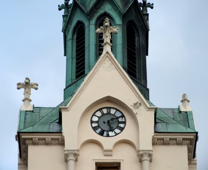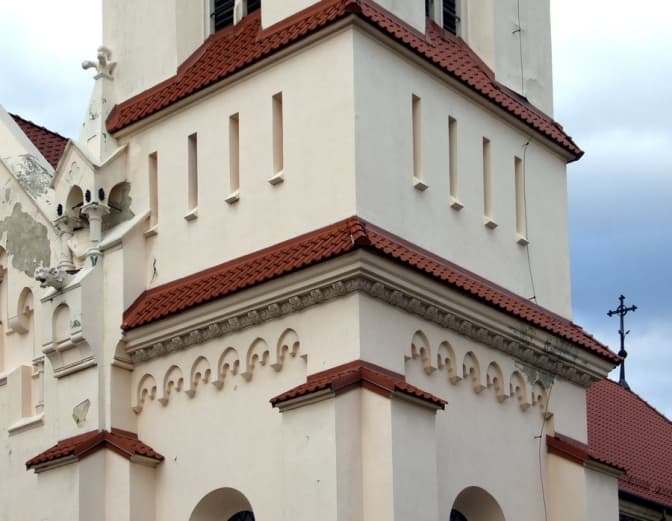 Костел колись будувався в стилі модерн з елементами неоготики, особливо фронтальна частина. Основний корпус будівлі — двоярусний, форми базиліки, вікон і трьох вхідних дверей мають конусоподібну арку, вікна спільні для обох ярусів, великі, оздоблені вітражами із кольорового скла пропускають багато світла.