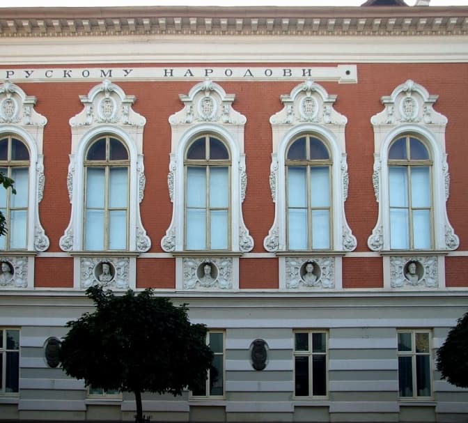 Фасад Народного дому викладений зі світло-вишневої цегли, не був тинькований. Вікна оздоблені орнаментом світло-кремового кольору. Під вікнами у нішах розміщені бронзового кольору бюсти видатних діячів української культури. Згори на фасаді — напис «Рускому народови», бо українці тоді ще називали себе «русинами». Парадний хід, як і сьогодні, був праворуч, але раніше було ще двоє дверей — посередині фасаду і на розі. Над парадним входом і над сценою був галицький герб — золотий лев на блакитному тлі. 47 років герби були заліплені гіпсом і замальовані червоними п'ятикутними радянськими зірками. На сходах парадного входу були декоративні світильники — спочатку «спірутисові», а потім електричні. Коли будівлю віддали під Дім офіцерів, світильники демонтували.