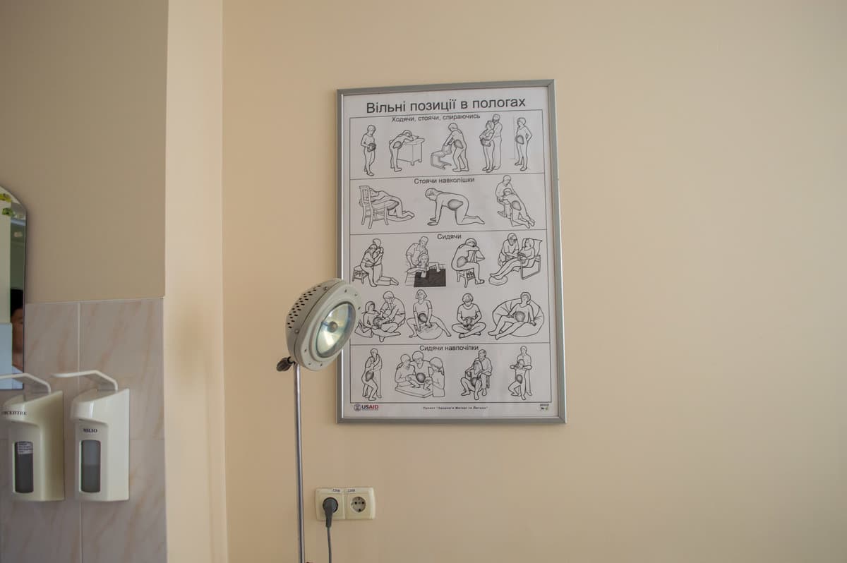 Спускаємось на поверх нижче, де перебувають мами з немовлятами. Тим часом головна лікарка розповідає, що кожен пологовий зал і кожна палата оснащені абсолютно однаково — хіба кольори можуть різнитись. Так, у пологових залах є монітор для спостереження за серцебиттям плоду, ліжко-трансформер, м’яч, драбинка, відсмоктувач, лампа підігріву.