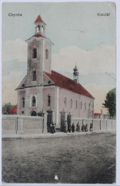 Парафія та перший дерев'яний костел у Хирові постали 1531 року завдяки Андрію Тарло. У 40-х роках XVII століття храм згорів, а на його місці спорудили невеличку святиню.