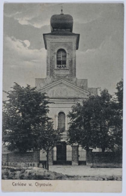 У 1507 році в Хирові вже існувала парафіяльна церква, яка отримала ерекційну грамоту від львівського хорунжого Анджея зі Щекажевичів у 1514 році. Попередню дерев’яну церкву Святого Миколая, збудовану на початку XVIII ст., розібрали у 1846 році. На її місці цього ж року звели теперішню муровану церкву Різдва Пресвятої Богородиці, двосхилий дах якої над західним причілком вінчає одноярусна восьмигранна у верхній частині вежа, вкрита банею з ліхтарем і маківкою. У 1847 році її освятив єпископ Снігурський. У 1882 році пожежа, що знищила місто, сильно пошкодила церкву. Її відновили у 1884 році. У 1922 році церкву відреставрували.