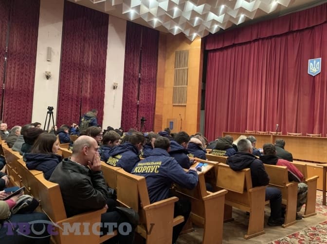 У холі Личаківської райадміністрації гуртується Нацкорпус, знімаючи куртки з однойменним написом. Вже під будівлею домовляються прийти й 27 листопада, коли у цій же залі сперечатимуться через подорожчання проїзду в трамваях і тролейбусах.