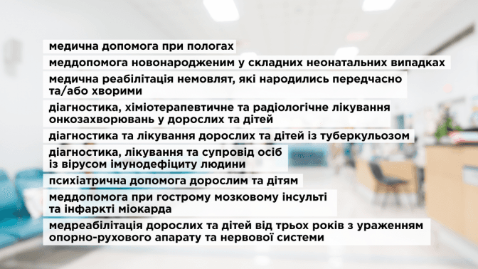 Тож тепер лікування інсульту, інфаркту, пологи, неонатальна допомога та рання онкодіагностика будуть пріоритетом. До їх надання є досить високі вимоги. Лікарні, де можуть надати ці послуги, повинні мати відповідні обладнання та спеціалістів. Будуть встановлені певні заклади в тому чи тому регіоні, де надаватимуть таку допомогу, і пацієнта везтимуть саме туди. Лікарні, що не відповідають вимогам, контрактуватись на ці послуги НСЗУ не будуть.