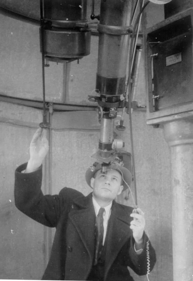 Телескоп-рефрактор Мерца-Зендтнера з фотографічною камерою, придбаний М. Ернстом у 1914 р. Біля телескопа Володимир Степанов (1913-1986 р.р.). Фото кінця 40-х – початку 50-х