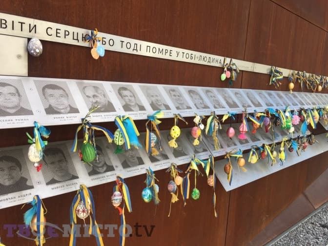 Меморіал Небесної сотні вітається яскравим світлом, іменами та портретами вічно живих та великоднім декором. Хтось фотографується на фоні неба, хтось просто дивиться на місто з висоти. Газончиком біжить песик, хазяйка намагається його наздогнати. Правда, тут все зовсім інакше — тихіше та повільніше. Повітря тягуче та вигріте сонцем.