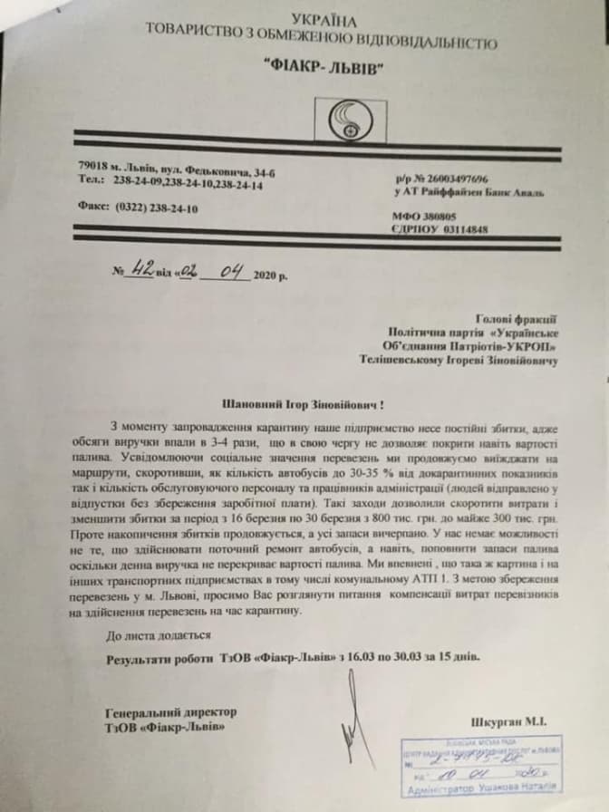 У листах до депутатів ТзОВ «Міра і К», «Фіакр-Львів» та АТП-14630 зазначили, що з моменту запровадження карантину підприємства несуть постійні збитки, адже обсяги виручки впали у 3-4 рази, що у свою чергу не дозволяє покрити навіть вартості палива.