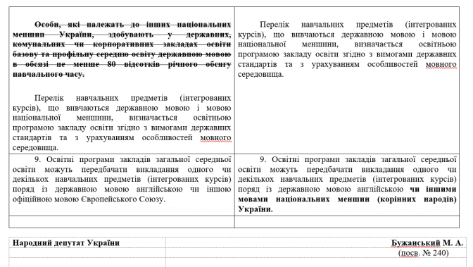 Натомість Бужанський хоче, щоби «перелік навчальних предметів, що вивчаються державною мовою, визначався освітньою програмою закладу освіти з урахуванням особливостей мовного середовища».