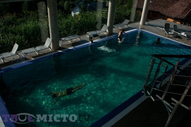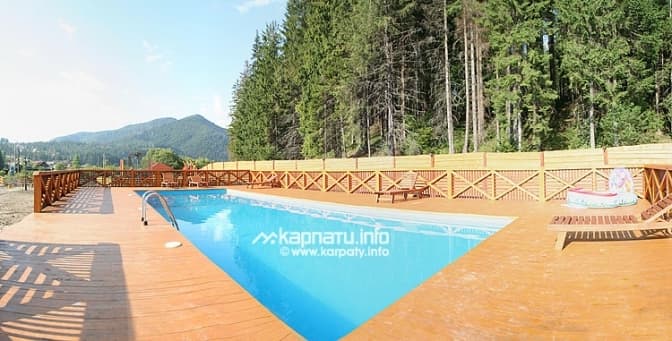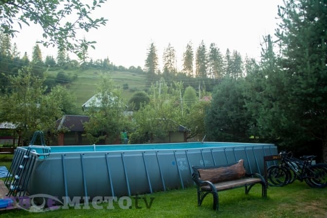 Як розповідає менеджерка пансіонату Соломія, обидва басейни – і дорослий, і дитячий – з підігрівом. Вода в дорослому, що розрахований на приблизно 25-30 гостей, підігрівається до 24 градусів, на ніч його накривають спеціальним тентом, щоб вода не охолоджувалась. У дитячому вода ще тепліша. Останній зовсім неглибокий і має фонтани, що веселять малечу. У дорослому басейні є водні масажери, перепад глибини тут – від 1,2 до 1,6 метрів.