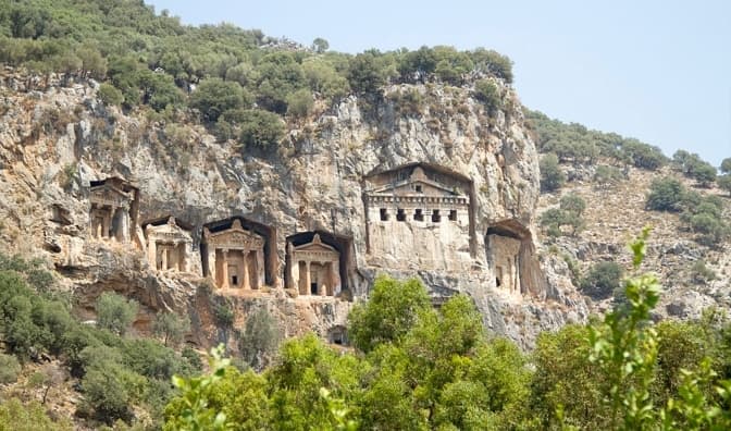 Древній архітектор постарався так, що й нині його витвір видно з різних куточків Дальяна, а з набережної і поготів. Набережна, до речі, тягнеться на кілька кілометрів. В один бік від центрального майдану з мечеттю – відкрита ділянка з причалами й терасами ресторанів, в інший – тіниста алея, де приємно гуляти навіть у полуденну спеку. На горі вирізняються два комплекси домовин: один готовий, другий – незавершений. Можна почути, що найбільший мавзолей був призначений для Олександра Македонського. Але це байка. Більш імовірно, що лікійці вірили, що душі померлих перевтілюються у крилатих істот, тому видовбували поховання ближче до неба. І подалі від грабіжників могил. На жаль, їх усе ж таки розікрали ще до того, як з’явилася наука археологія. Хоч без альпіністського обладнання до гробниць, чесно кажучи, не підібратися.