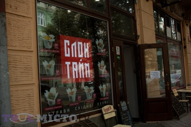 Фасади перших поверхів кам’яниць на вулиці Степана Бандери можна назвати словом «шанхай» – не в сенсі сучасності, блиску та модерну, а через безліч різноманітних фастфудів, кав’ярень, секонд-хендів та магазинів з усім на світі. Вивіски змагаються закликами – у кого дешевше. Біля деяких з них у купки збираються студенти, п’ють каву, сміються. Підсилюють відчуття «шанхаю» різні графіті, написи та обдерті оголошення.