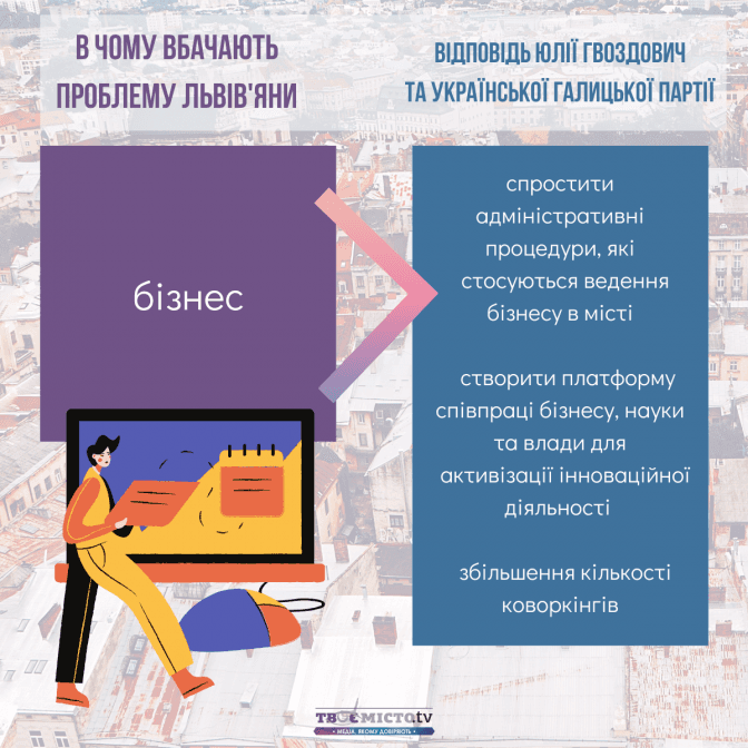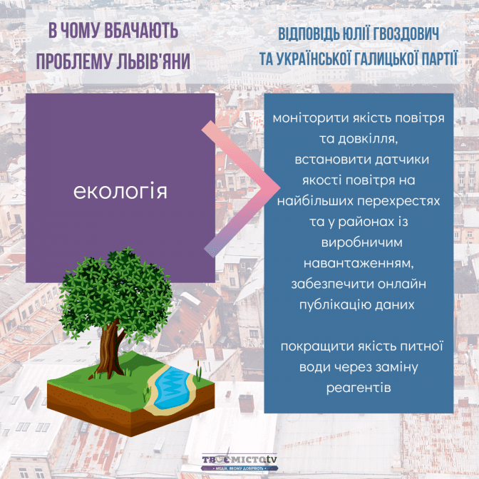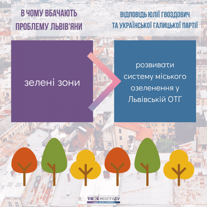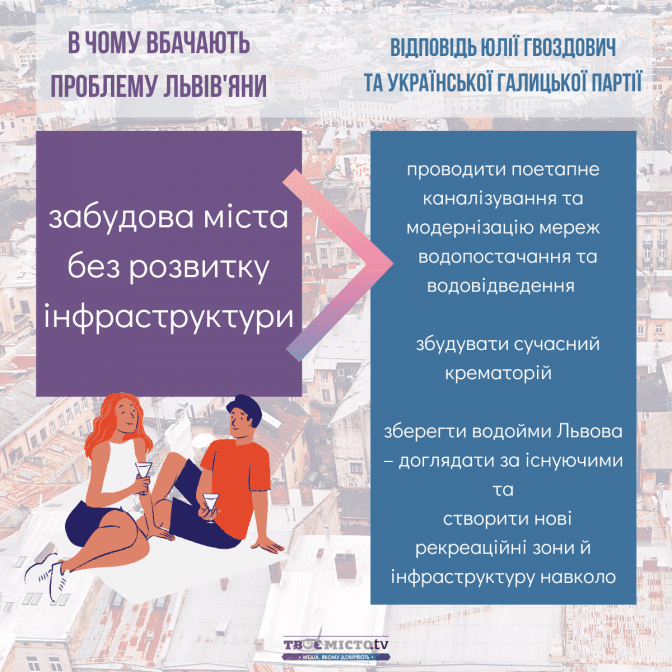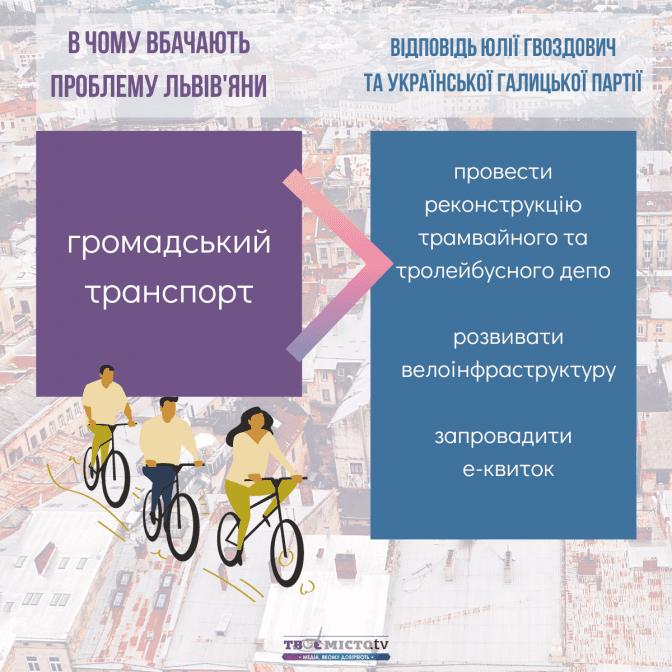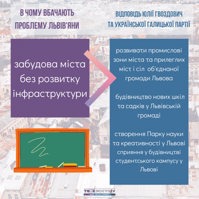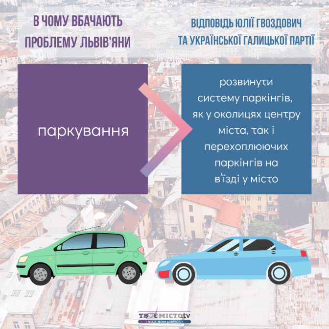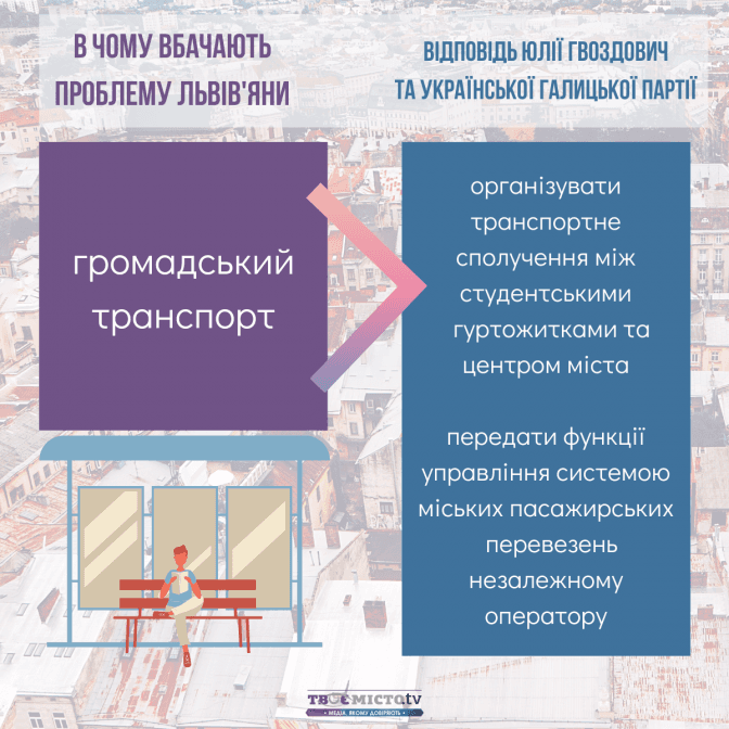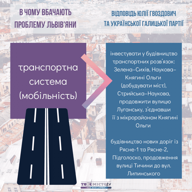 Зіставивши наміри Юлії Гвоздович та УГП із запитами львів’ян, можна дійти висновків: найбільше ініціатив передбачено в сфері транспортної мобільності та розвитку міської інфраструктури. Натомість проєкти, спрямовані на розбудову зелених зон і паркінгів, – не конкретизовані.