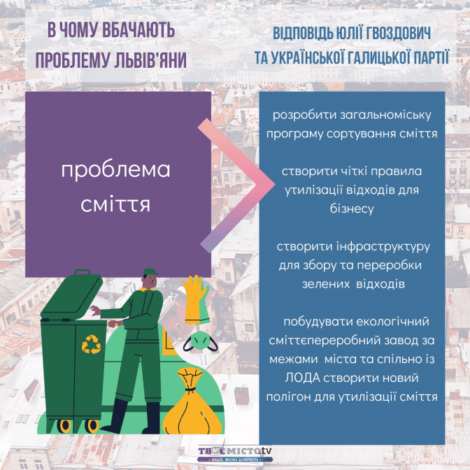 - «побудувати екологічний сміттєпереробний завод за межами міста та спільно із ЛОДА створити новий полігон для утилізації сміття».