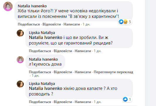 Про інший випадок у коментарях на фейсбук-сторінці Твого міста написала читачка. За її словами, її недолікованого чоловіка відправили лікуватись удома у зв'язку з карантином.